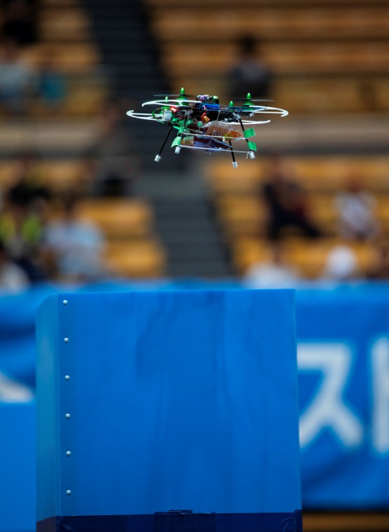 マルチコプタ部門は,機体,基板,制御プログラムなど全てを自作した,複数のプロペラを持つドローンで物資運搬,